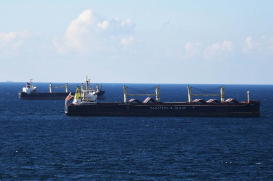 2022年8月6日,從烏克蘭出發(fā)的第二批運糧船抵達土耳其伊斯坦布爾的博斯普魯斯海峽黑海入??诟浇?。(新華社記者沙達提攝)