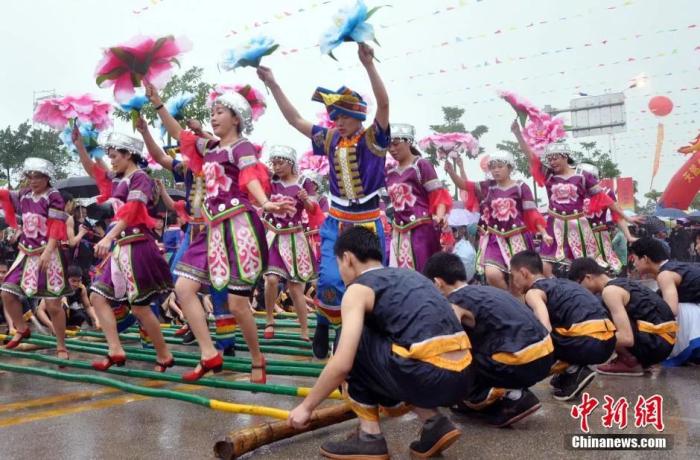 壯族民眾著盛裝歡跳竹竿舞。黃艷梅 攝