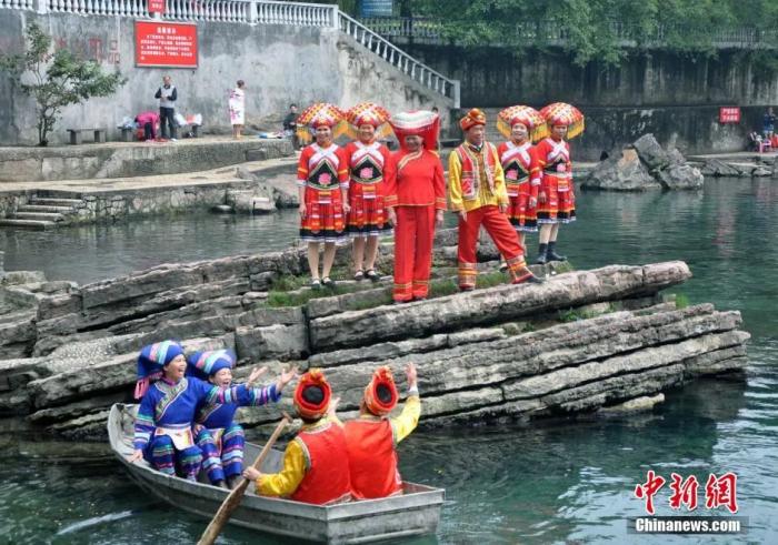苗族姑娘向游客展示自己的民族服飾。石峰 攝