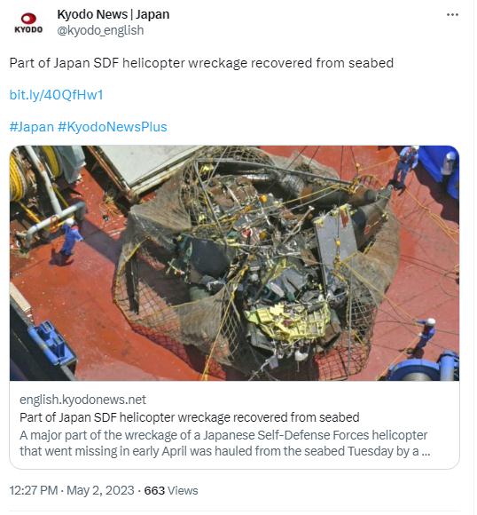 據(jù)報(bào)道,潛水員此前在伊良部島以北6公里海域106米深處,發(fā)現(xiàn)了失聯(lián)直升機(jī)主體部分。5月2日,該部分被打撈網(wǎng)撈出水面。