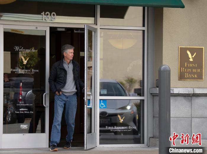 當?shù)貢r間5月1日,一名男子走出位于美國加州米爾布雷市的一家第一共和銀行。 中新社記者 劉關(guān)關(guān) 攝
