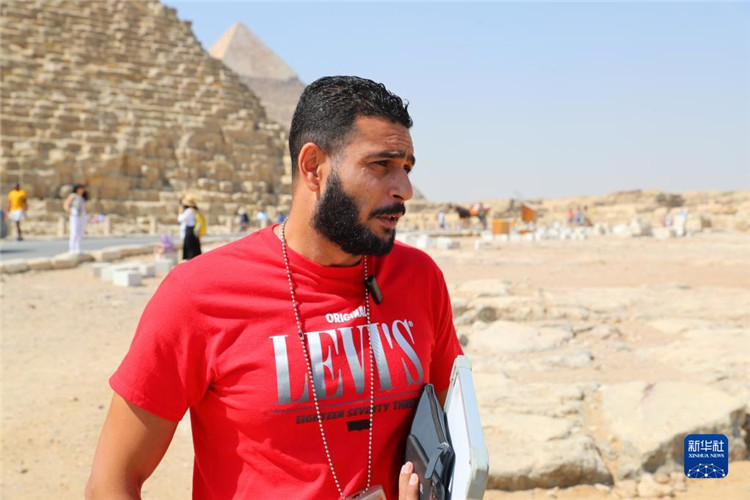 5月1日,埃及導游阿姆魯·蒂蒂在吉薩金字塔群景區(qū)介紹埃及旅游現(xiàn)狀。新華社記者 隋先凱 攝