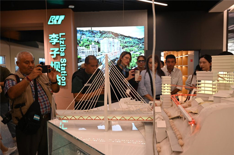 5月2日,在重慶市規(guī)劃展覽館,洪都拉斯媒體代表團一行參觀重慶立體交通模型。新華社記者 趙佳樂 攝