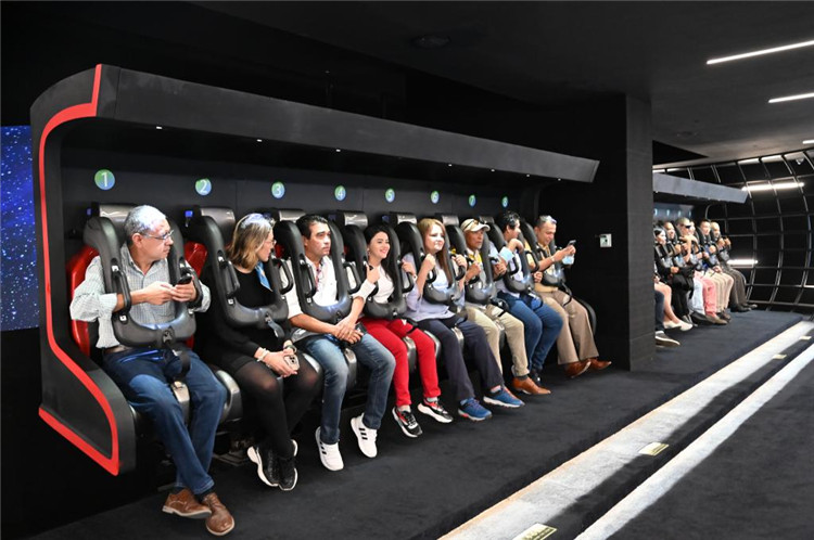 5月2日,洪都拉斯媒體代表團一行在重慶市規(guī)劃展覽館體驗“飛越重慶”飛行影院。新華社記者 趙佳樂 攝