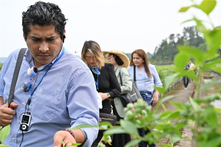 5月2日,洪都拉斯媒體代表團代表團走進重慶市南川區(qū)大觀鎮(zhèn)藍莓產(chǎn)業(yè)示范基地。新華社記者 趙佳樂 攝