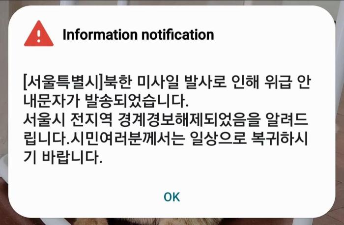 7時26分左右,首爾市再次發(fā)布通知稱,“由于朝鮮發(fā)射導彈,發(fā)送了危急災害通知。在此通知,首爾市整個地區(qū)的警戒警報已經解除。希望各位市民回到日常生活中去。”