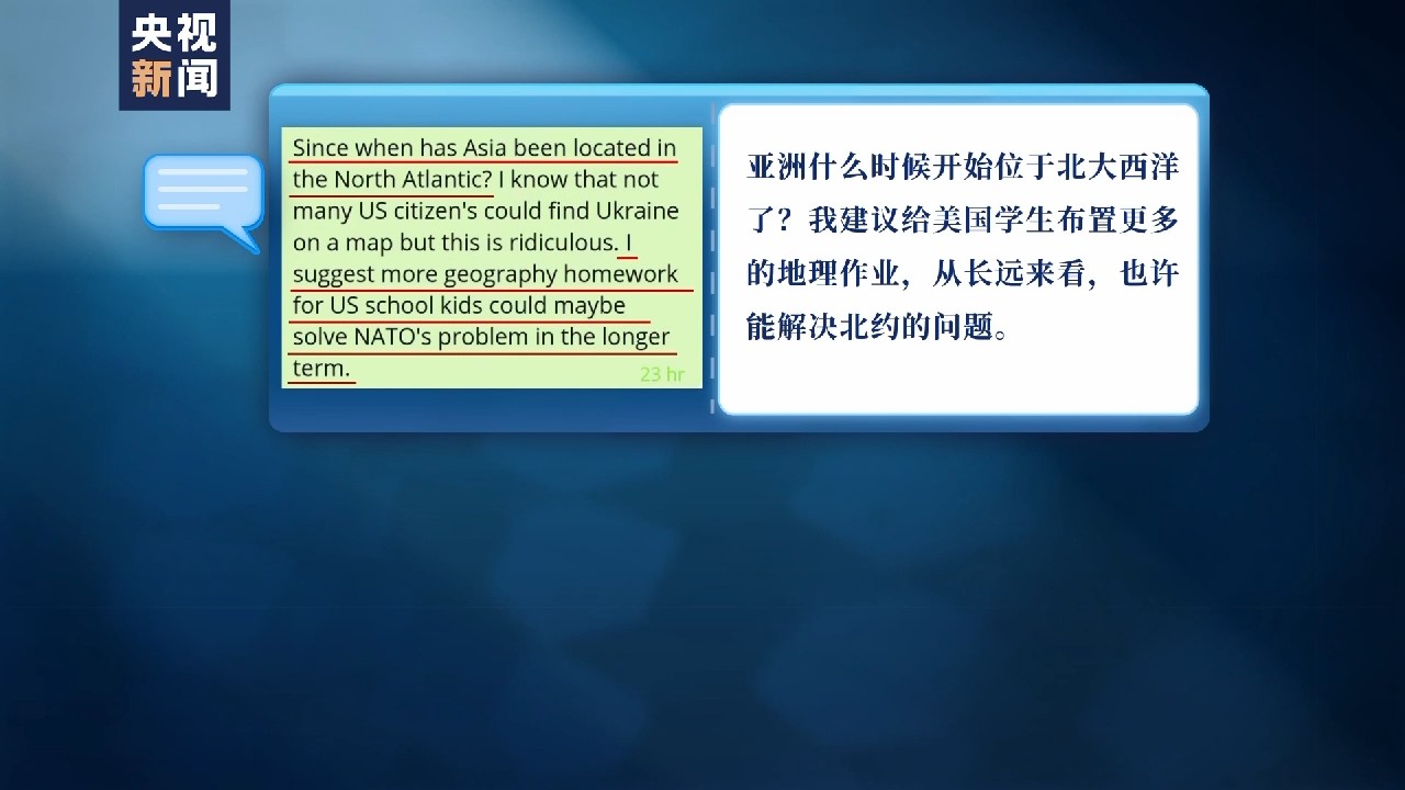 “亞洲什么時(shí)候開始位于北大西洋了?我建議給美國(guó)學(xué)生布置更多的地理作業(yè),從長(zhǎng)遠(yuǎn)來(lái)看,也許能解決北約的問(wèn)題?!?/p>