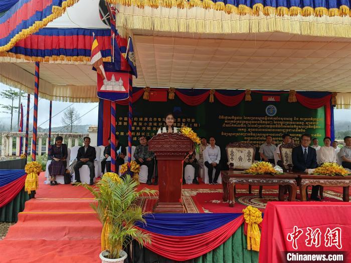 當?shù)貢r間6月18日,“瀾湄國家典型小流域綜合治理示范(三期)”項目俄勒塞村成果移交儀式在柬埔寨國公省莫邦縣舉行。圖為中國駐柬埔寨大使館公使銜參贊趙海燕致辭?!≈行律缬浾?楊強 攝