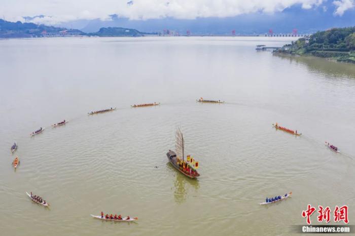 2021年10月,中國(guó)龍舟爭(zhēng)霸賽在湖北秭歸縣徐家沖港灣國(guó)家級(jí)龍舟訓(xùn)練基地舉行,圖為龍舟游江儀式。聶爽 攝