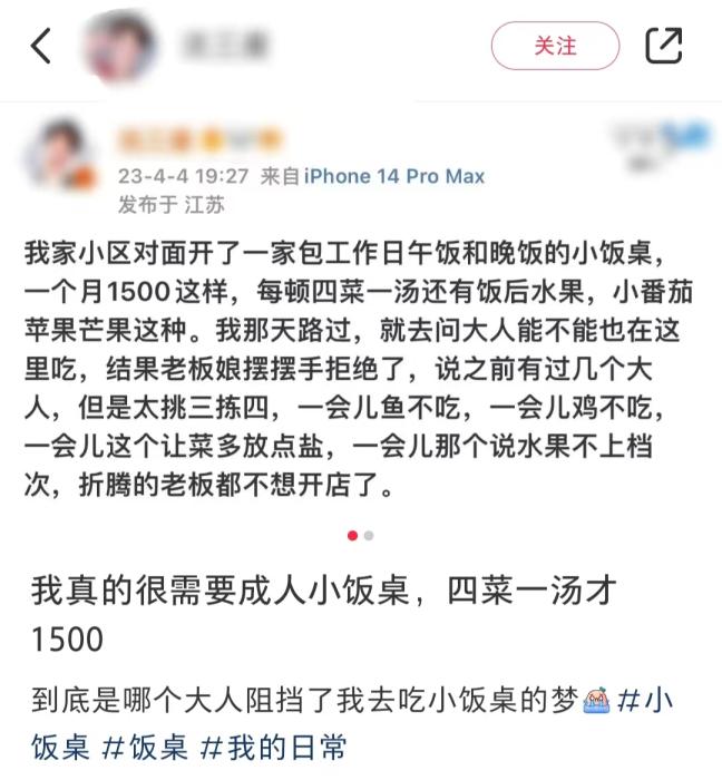 也有網友表示,由于自己吃太多,還被小飯桌漲了價?!耙驗槌扇撕蛯W生食量和需求不同,價格都需要跟小飯桌重談。”