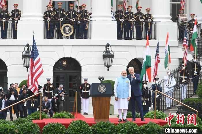 當(dāng)?shù)貢r間6月22日,印度總理莫迪對美進(jìn)行國事訪問。圖為美國總統(tǒng)拜登與莫迪出席白宮歡迎儀式。中新社記者 陳孟統(tǒng) 攝