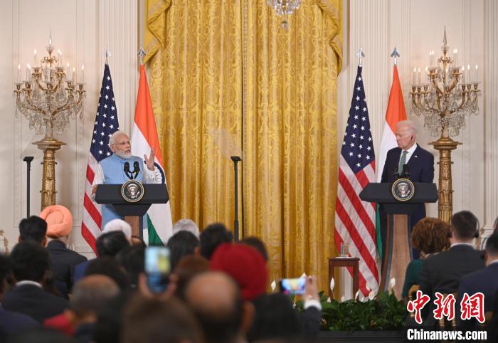 當(dāng)?shù)貢r間6月22日,印度總理莫迪對美進(jìn)行國事訪問。圖為美國總統(tǒng)拜登與莫迪在白宮出席聯(lián)合記者會。中新社記者 陳孟統(tǒng) 攝