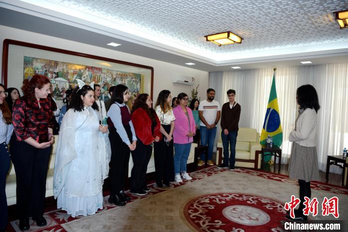 6月21日,端午開放日活動(dòng),巴西青年學(xué)子參觀總領(lǐng)館,前排左二為露西婭。中新社記者 林春茵 攝