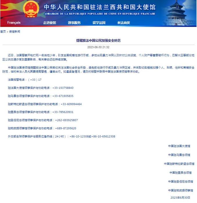 中新網(wǎng)7月1日電 據(jù)中國駐法國大使館當(dāng)?shù)貢r(shí)間6月30日消息,法國警察開槍射殺少年事件,在法國引發(fā)全國規(guī)模性游行示威,事態(tài)持續(xù)發(fā)酵,中國駐法國大使館提醒旅法中國公民加強(qiáng)安全防范。