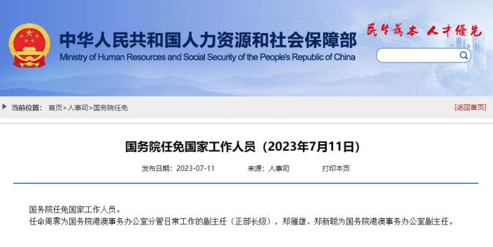 任命周霽為國務(wù)院港澳事務(wù)辦公室分管日常工作的副主任(正部長級(jí)),鄭雁雄、鄭新聰為國務(wù)院港澳事務(wù)辦公室副主任。