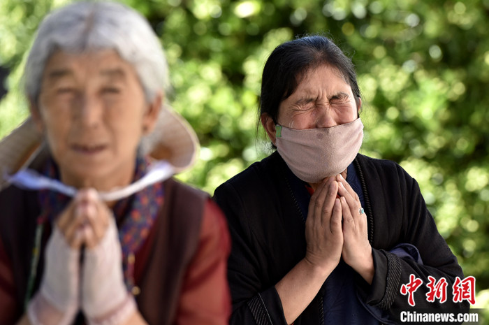 7月17日,信眾被班禪摸頂賜福后,激動不已、流下眼淚。 中新社記者 李林 攝