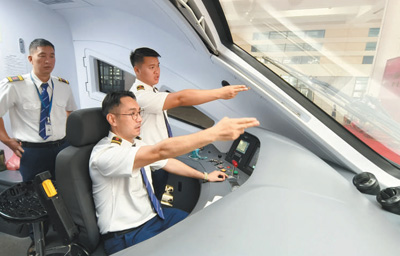 4月13日,在老撾萬象站,中老雙方司機在首列萬象至昆明的中老鐵路國際旅客列車上為發(fā)車做準(zhǔn)備。