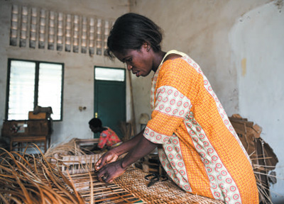 6月21日,在位于布隆迪經(jīng)濟首都布瓊布拉的卡蒙蓋手工業(yè)培訓(xùn)中心,學(xué)員在生產(chǎn)車間制作藤編產(chǎn)品。