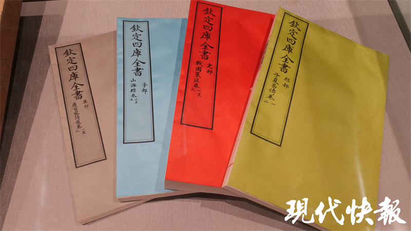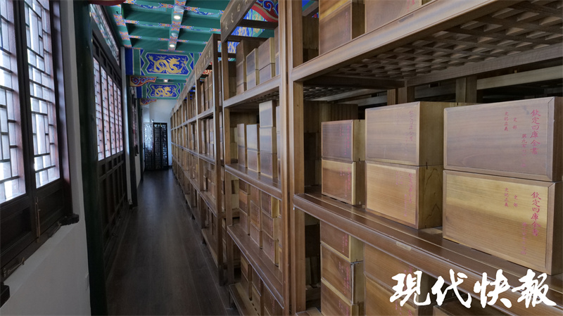 文匯閣二樓、三樓收藏了一部《四庫全書》,據(jù)了解,這部《四庫全書》是2013年由商務印書館榮譽出版、揚州國書文化公司策劃制作的原樣、原大、原色《四庫全書》復制本。它與原書大小、顏色、紙質、裝幀相同,封面仍是絹帛五色:經(jīng)部綠色、史部紅色、子部月白色、集部灰黑色、總目黃色。書籍與書函、書架配套,共計木函6144個、書架128個?!端膸烊珪返难b潢非??季浚坎繒加脙善酒瑠A住,束以綢帶,再放入楠木盒中。盒蓋上刻有書籍的書名和所屬部類順序等信息,以便查閱。現(xiàn)在,游客經(jīng)過預約就可以可到二樓參觀《四庫全書》部分藏書,親身感受這套浩瀚巨制。