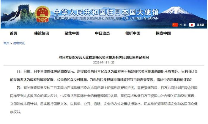 中新網7月19日電 據中國駐日本大使館網站消息,中國駐日本使館發(fā)言人就福島核污染水排海有關民調結果答記者問時表示,日方排海計劃在周邊鄰國同樣受到大多數民眾的堅決反對,也沒有得到國際社會的普遍理解和認可;再次敦促日方正視國內外合理關切和反對聲音,立即叫停排海計劃。