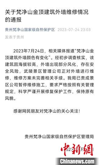 7月24日,有媒體報(bào)道“梵凈山金頂建筑外墻顏色有變化”,原本灰色墻體被刷成了粉紅色,不少網(wǎng)友提出疑問,梵凈山作為世界自然遺產(chǎn)地是否可以隨意粉刷?對此,管理局作出上述回應(yīng)。