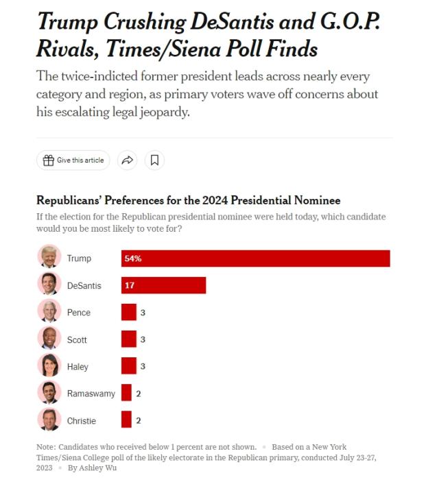 中新網(wǎng)7月31日電 據(jù)《紐約時報》報道,《紐約時報》和錫耶納學(xué)院31日公布了一項針對共和黨選民的聯(lián)合民意調(diào)查結(jié)果:在所有的共和黨總統(tǒng)競選人中,特朗普以54%的支持率取得絕對領(lǐng)先地位,超出第二位德桑蒂斯37%,其余候選人支持率均未超過3%。