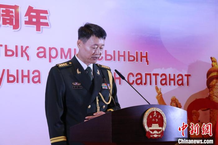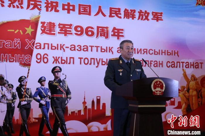 當?shù)貢r間7月28日晚,哈薩克斯坦阿斯塔納,中國駐哈薩克斯坦大使館舉行慶祝中國人民解放軍建軍96周年招待會。圖為國防武官胡德君大校在致辭中?! ≈行戮W記者 張碩 攝
