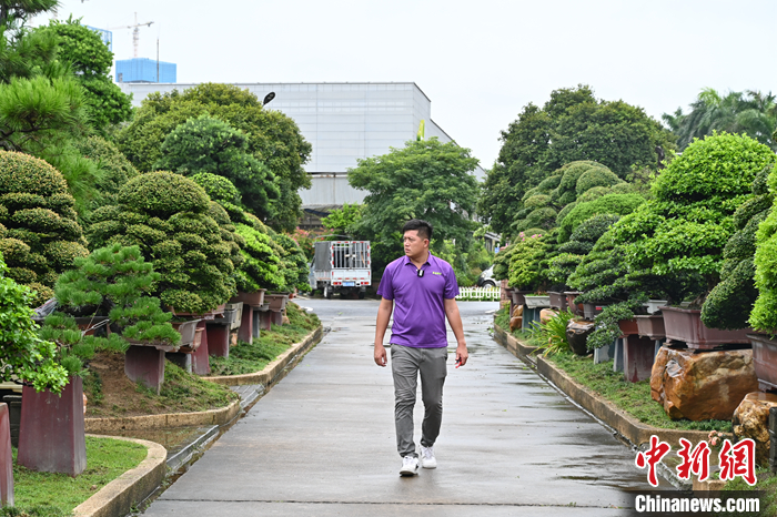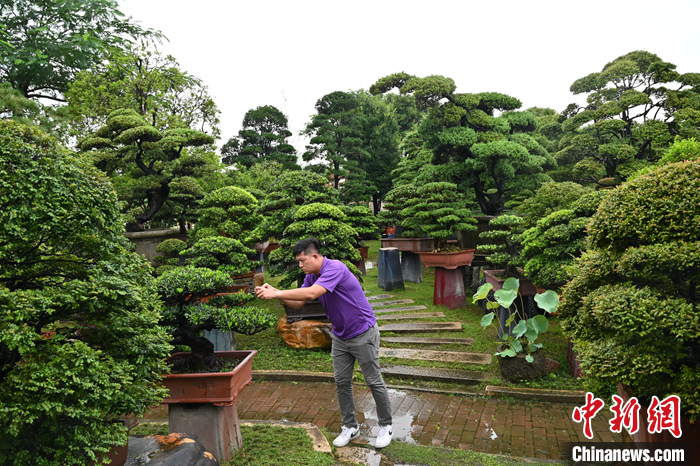 圖為7月18日,廣東佛山,王俞又在嘉盛園藝總場(chǎng)查看盆景長(zhǎng)勢(shì)。 中新社記者 陳楚紅 攝