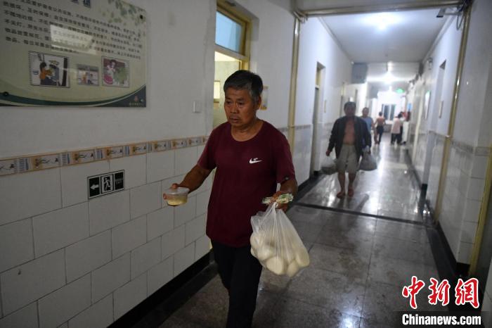 這是一間有八張床位的學(xué)生宿舍,屋頂?shù)碾娚纫恢贝抵.?dāng)記者走進(jìn)房間時(shí),劉玉霞正吃著丈夫剛領(lǐng)回的盒飯?!耙粋€是白菜粉條,一個是木須肉,還有湯,挺好?!痹诶先丝磥恚晏炖锍钥跓犸?,“家人平安已知足”。