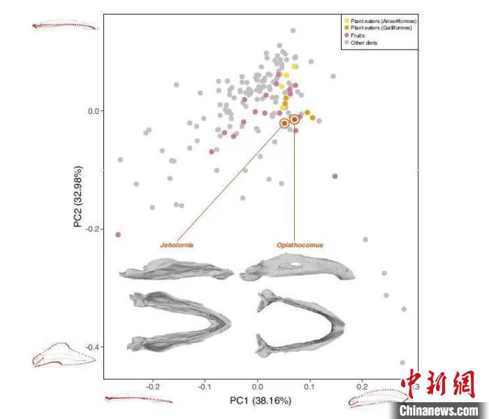 包括熱河鳥和現(xiàn)存鳥類在內(nèi)的三維下頜形狀PCA圖,重點與現(xiàn)存植食性鳥類對比。中國科學(xué)院古脊椎所 供圖