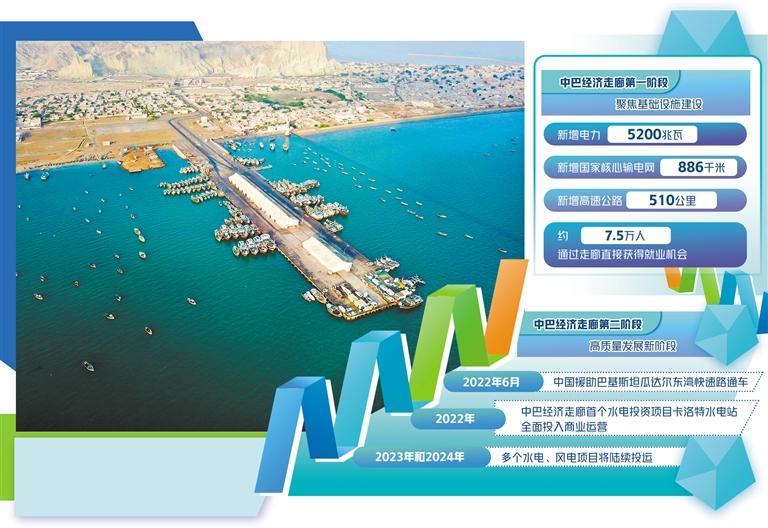 當(dāng)前正處于中巴經(jīng)濟(jì)走廊建設(shè)的第二階段,這也是至關(guān)重要的高質(zhì)量發(fā)展新階段。中巴雙方在走廊框架下,進(jìn)一步加強(qiáng)巴國工業(yè)化進(jìn)程、人力資源培訓(xùn)和產(chǎn)業(yè)園區(qū)建設(shè),在扶貧、醫(yī)療、農(nóng)業(yè)以及互聯(lián)網(wǎng)等眾多與民生息息相關(guān)的領(lǐng)域持續(xù)深化合作,力求創(chuàng)造更多就業(yè)機(jī)會(huì),不斷推動(dòng)巴基斯坦的經(jīng)濟(jì)和社會(huì)現(xiàn)代化發(fā)展,造福當(dāng)?shù)孛癖姟?022年6月,中國援助巴基斯坦瓜達(dá)爾東灣快速路通車,打通了瓜達(dá)爾港和卡拉奇之間的交通運(yùn)輸通道。同年,中巴經(jīng)濟(jì)走廊首個(gè)水電投資項(xiàng)目——卡洛特水電站全面投入商業(yè)運(yùn)營,每年將向巴基斯坦提供32億千瓦時(shí)廉價(jià)清潔電能,滿足當(dāng)?shù)?00萬人用電需求,每年可節(jié)約標(biāo)準(zhǔn)煤約140萬噸,減少二氧化碳排放350萬噸。今明兩年,走廊框架下的多個(gè)水電、風(fēng)電項(xiàng)目將陸續(xù)投運(yùn),未來巴基斯坦在清潔能源領(lǐng)域大有可為。