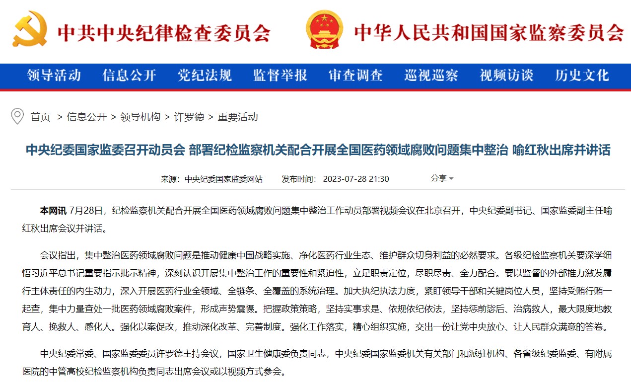 7月21日,國家衛(wèi)生健康委會(huì)同教育部、公安部、審計(jì)署、國務(wù)院國資委、市場(chǎng)監(jiān)管總局、國家醫(yī)保局、國家中醫(yī)藥局、國家疾控局、國家藥監(jiān)局,十個(gè)部門聯(lián)合召開視頻會(huì)議,部署開展為期1年的全國醫(yī)藥領(lǐng)域腐敗問題集中整治工作。