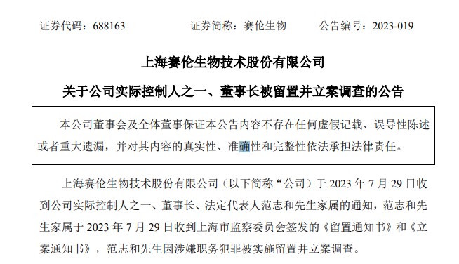 公告稱,賽倫生物實(shí)際控制人之一、董事長、法定代表人范志和于2023年7月29日收到上海市監(jiān)察委員會(huì)簽發(fā)的《留置通知書》和《立案通知書》,范志和因涉嫌職務(wù)犯罪被實(shí)施留置并立案調(diào)查。
