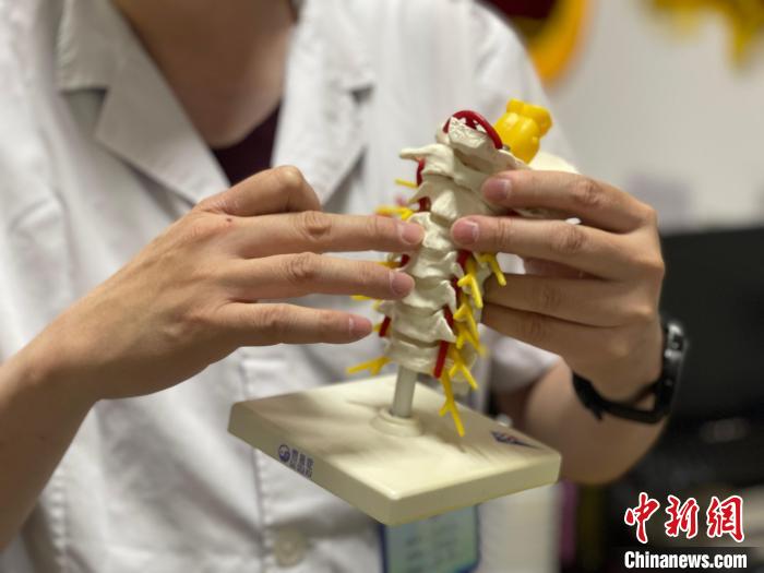 7月10日,閔楷家展示脊柱模型?!⌒焐荷?攝
