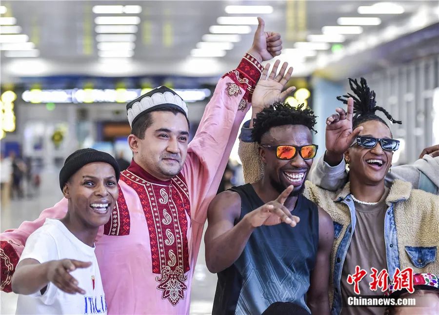 2023年7月23日,參加第六屆中國新疆國際民族舞蹈節(jié)的南非埃爾維斯舞蹈藝術團乘機抵達烏魯木齊,主辦方用新疆歌舞迎接遠道而來的客人。劉新 攝