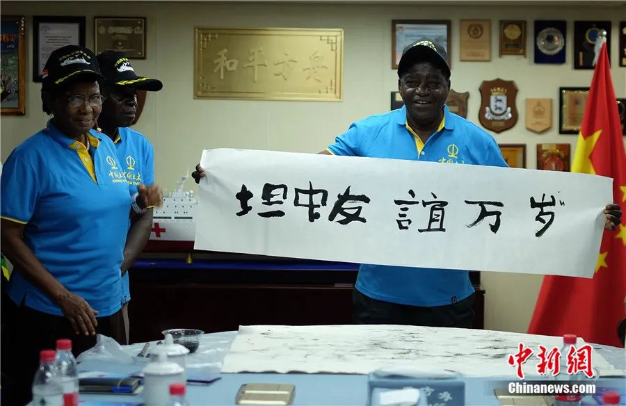 67歲的坦贊鐵路坦方員工秋馬展示自己書寫的“坦中友誼萬歲”書法作品。江山 攝