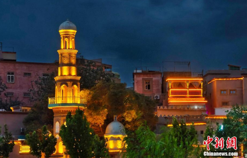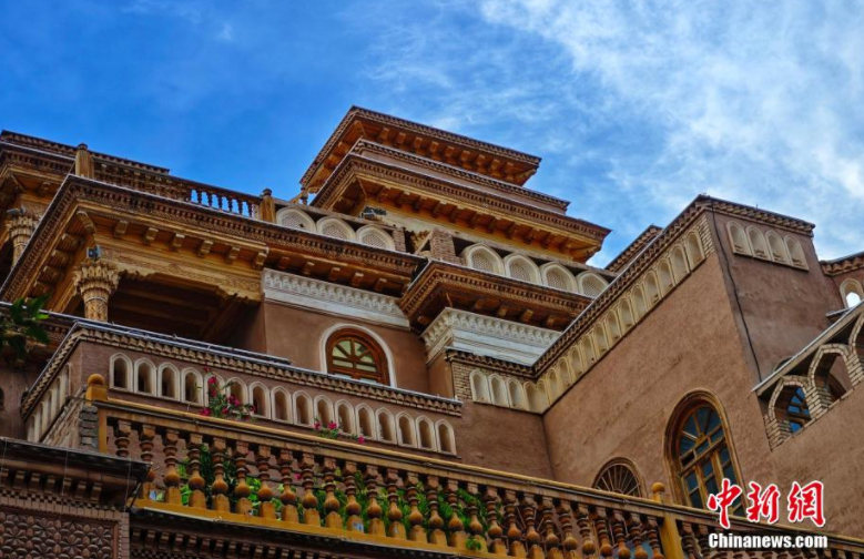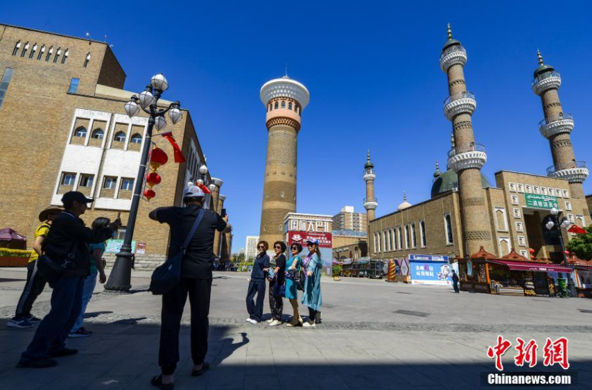 新疆國(guó)際大巴扎景區(qū),游客在地方特色建筑前參觀(guān)游覽。劉新 攝