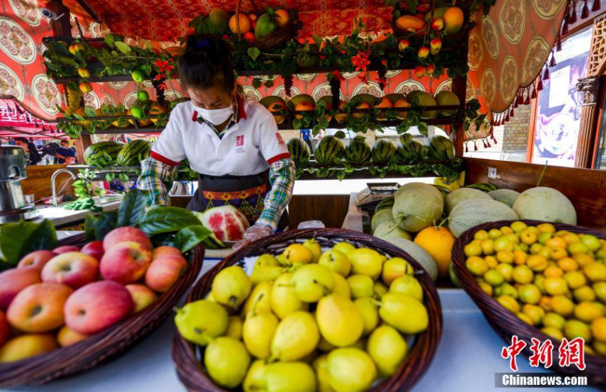 新疆一水果攤位,商戶(hù)正在切西瓜,制作水果拼盤(pán)。劉新 攝