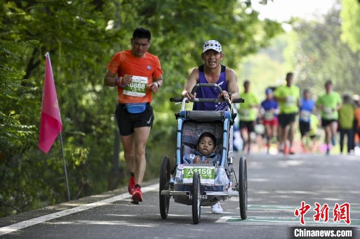 浙江金華婺城人羅書(shū)堅(jiān)(右)推著兒子跑馬拉松(資料圖)。胡肖飛攝