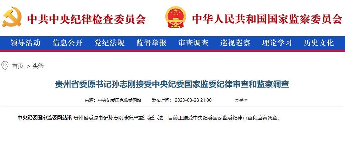 中新網(wǎng)北京8月29日電(記者 袁秀月)又見深夜打虎。中央紀(jì)委國(guó)家監(jiān)委網(wǎng)站28日晚通報(bào),貴州省委原書記孫志剛涉嫌嚴(yán)重違紀(jì)違法,目前正接受中央紀(jì)委國(guó)家監(jiān)委紀(jì)律審查和監(jiān)察調(diào)查。