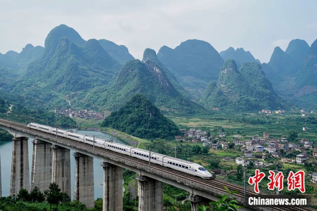 2019年5月,一列動車穿越位于廣西陽朔縣興坪鎮(zhèn)內(nèi)的幸福源特大橋。陳冠言 攝