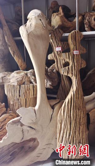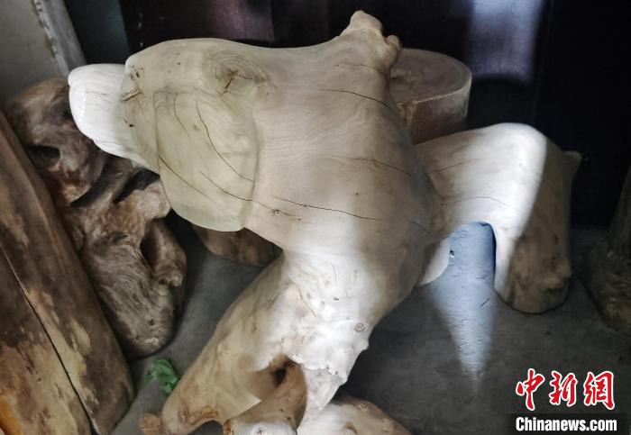 52歲的戴新是新疆生產(chǎn)建設(shè)兵團(tuán)第一師十團(tuán)苗木基地的技工,因長(zhǎng)年癡迷于根雕藝術(shù),依靠當(dāng)?shù)囟鄻拥牧謽I(yè)資源制作各類根雕,不僅建起根雕廠,還利用閑置的房屋,分門別類設(shè)立了多間根雕展示廳。