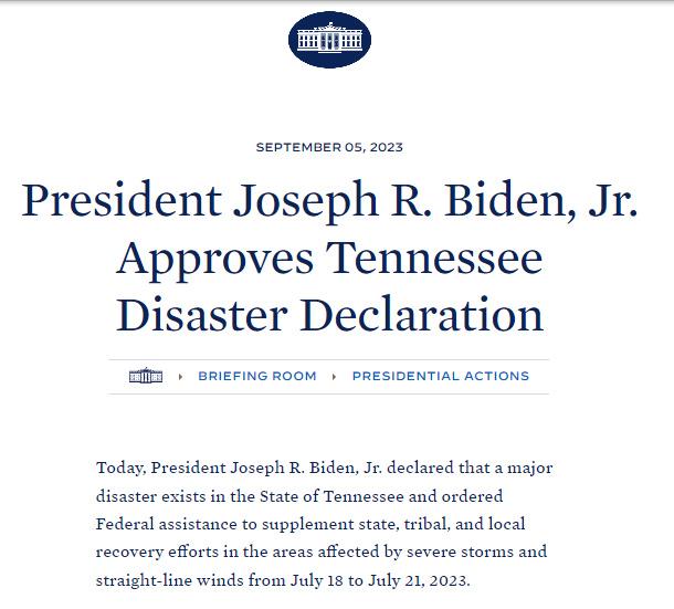 中新網(wǎng)9月6日電 據(jù)白宮官網(wǎng)消息,當(dāng)?shù)貢r間9月5日,美國總統(tǒng)拜登批準(zhǔn)田納西州重大災(zāi)難聲明,并下令為田納西州從7月18日開始至7月21日期間受風(fēng)暴影響的地區(qū)提供聯(lián)邦援助。