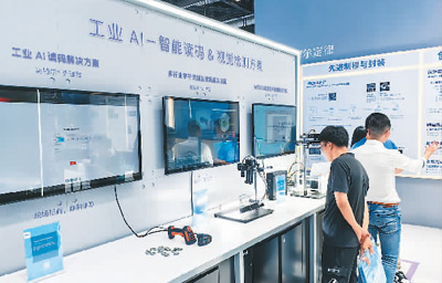 觀眾在英特爾展區(qū)的工業(yè)AI展臺參觀手持智能終端、視覺控制器等設(shè)備。