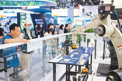 9月4日,在服貿(mào)會(huì)綜合展區(qū),參觀者正在觀看智能焊接機(jī)器人工作。