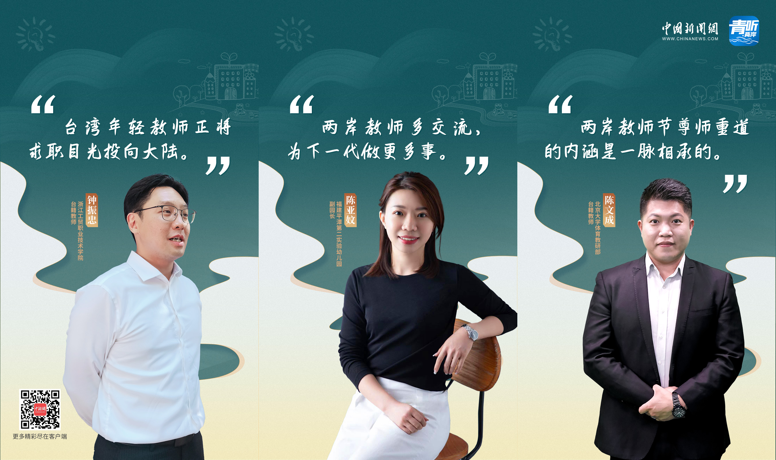 教師節(jié)這天,北京大學(xué)體育教研部教師陳文成、浙江工貿(mào)職業(yè)技術(shù)學(xué)院教師鐘振忠、福建平潭第二實(shí)驗(yàn)幼兒園副園長(zhǎng)陳亞妏,三位臺(tái)籍教師做客中國(guó)新聞網(wǎng)《青聽·兩岸》欄目,分享了他們“登陸”做老師的故事。