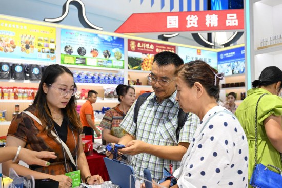 9月6日,游客(中)在第四屆中國(guó)—蒙古國(guó)博覽會(huì)上選購商品。新華社記者 貝赫 攝