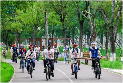 直播記錄下了外媒記者們騎行打卡世界規(guī)模最大的綠道系統(tǒng)——天府綠道核心“一軸”錦江綠道的全程:從鳥(niǎo)語(yǔ)花香的桂溪生態(tài)公園出發(fā),在綠樹(shù)掩映的婚姻登記所簽訂“城市婚書(shū)”,在亞洲最大單體建筑新世紀(jì)環(huán)球中心南側(cè)濕地學(xué)習(xí)四川話(huà),在錦城湖4號(hào)湖畔撞線(xiàn)……