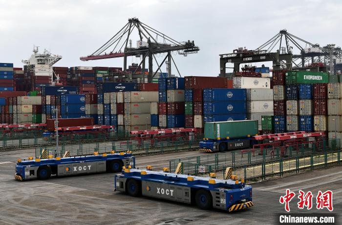 9月7日,廈門遠海自動化碼頭上,轉(zhuǎn)運集裝箱的自動導(dǎo)引車正在作業(yè)。這是全球首個第四代自動化碼頭、中國首個擁有全部自主知識產(chǎn)權(quán)的自動化碼頭,開行了多條“絲路海運”命名航線?!≈行律缬浾?張斌 攝