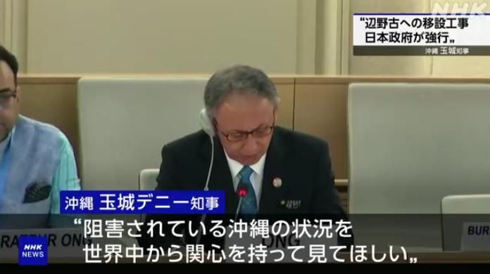 當(dāng)?shù)貢r間18日,日本沖繩縣知事玉城丹尼在瑞士日內(nèi)瓦召開的聯(lián)合國人權(quán)理事會上,抨擊美日政府不顧沖繩民眾民意強行推進美軍基地搬遷。圖片來源:日本放送協(xié)會(NHK)視頻截圖